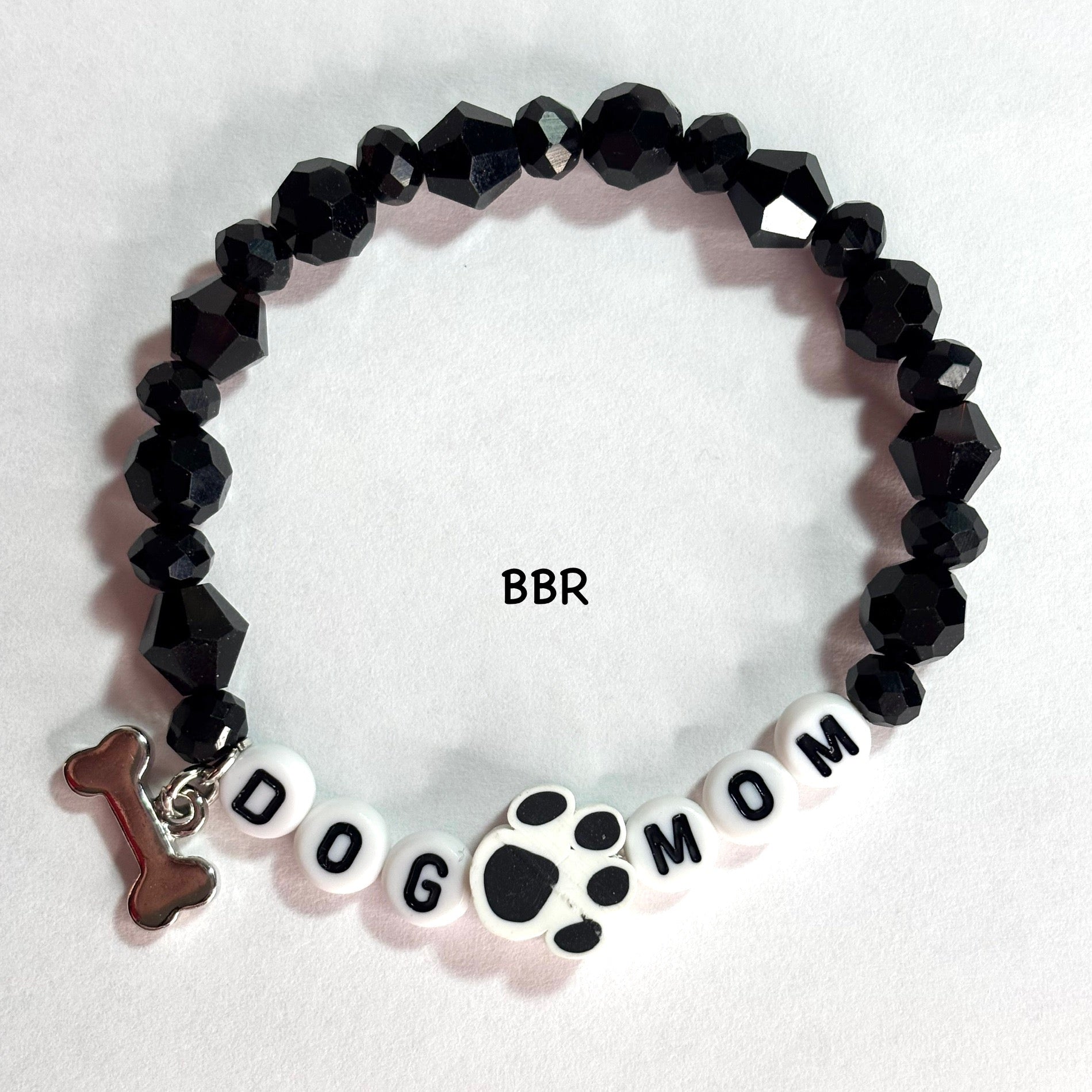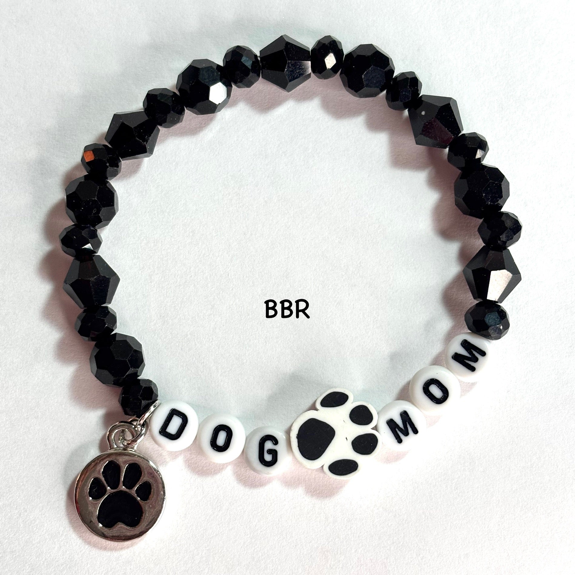 Handmade with beautiful faceted, bicone, and gemcut glass beads, letter beads, paw clay bead, and a metal dog charm.